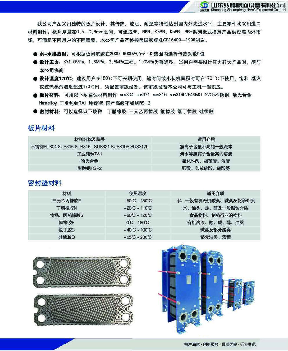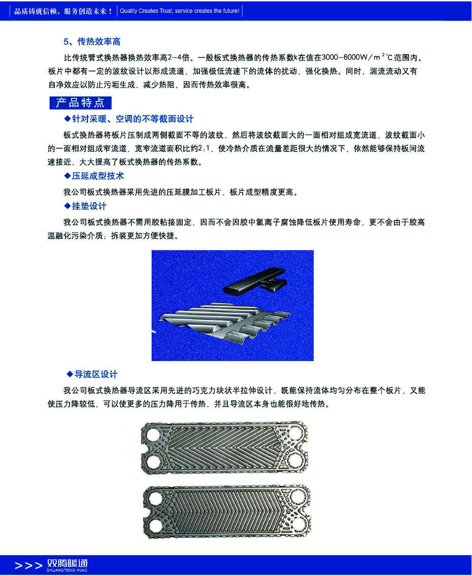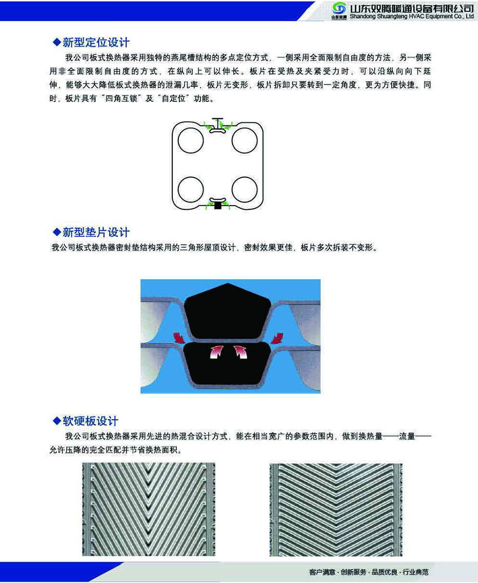 板式換熱器包含拼裝式、軒焊式、“寬間腺”自由流、雙壁式、半焊式、多段式等系列可廣泛應(yīng)用于鋼鐵、發(fā)電、有色金屬、油脂、化工、石化、船舶、暖通制冷、制藥、乳業(yè)、啤酒、飲料、集中供熱等領(lǐng)域。雙騰板式換熱器板片采用獨(dú)特設(shè)計(jì)采用超細(xì)網(wǎng)格的數(shù)值模擬技術(shù)結(jié)合精密的試驗(yàn)測(cè)量方法設(shè)計(jì)出流動(dòng)和傳熱性能優(yōu)越的換熱板片。板片獨(dú)特設(shè)計(jì)的板紋能使流體在較低流速下能產(chǎn)生湍流大大提高了換熱系數(shù)。板式換熱器由高效傳熱波紋板片及框架組成板片由螺栓夾緊在固定壓緊板及活動(dòng)壓緊板之間在換熱器內(nèi)部構(gòu)成了許多流道板與板之間用橡膠密封。壓緊板上有本設(shè)備與外部連接的接管。板片用優(yōu)質(zhì)耐腐蝕金屬薄板壓制而成四角沖有供介質(zhì)進(jìn)出的角孔上下有掛孔。人字形波紋能增加對(duì)流體的擾動(dòng)使流體在低速下能達(dá)到滿流狀態(tài)獲得高的傳熱效果。并采用特殊結(jié)構(gòu)保證兩種流體介質(zhì)不會(huì)串漏。