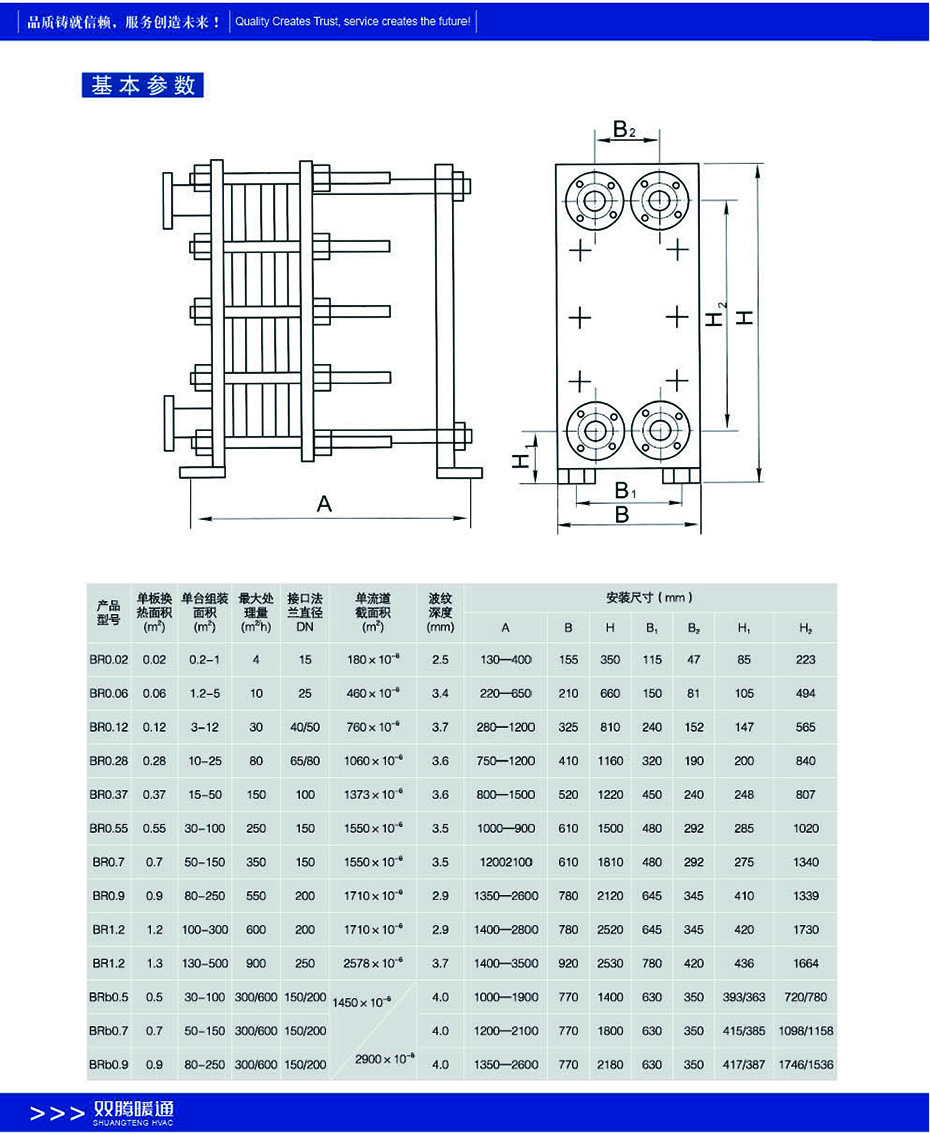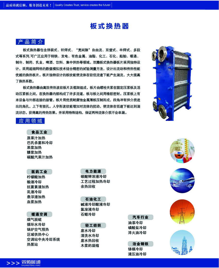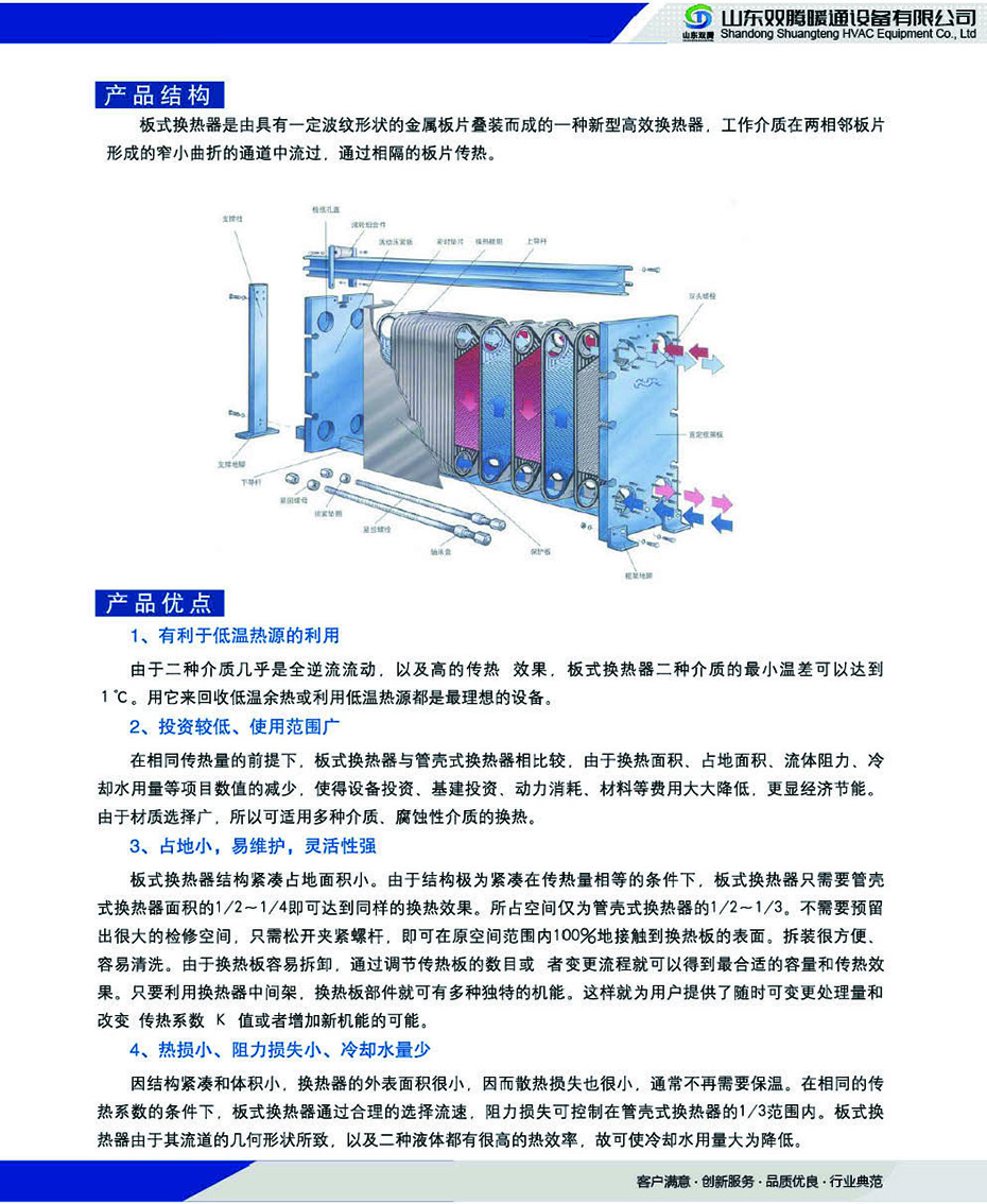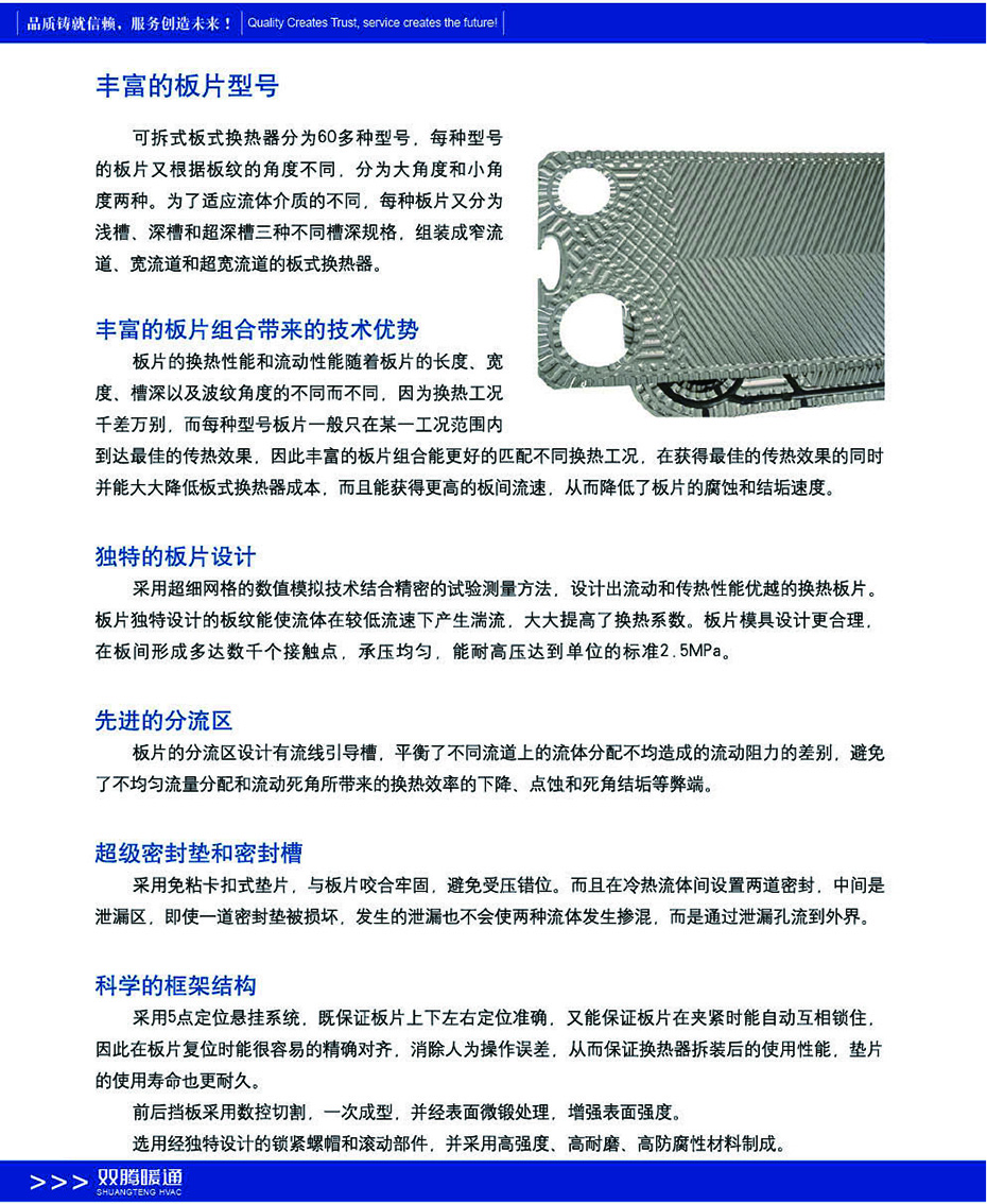 板式換熱器包含拼裝式、軒焊式、“寬間腺”自由流、雙壁式、半焊式、多段式等系列可廣泛應(yīng)用于鋼鐵、發(fā)電、有色金屬、油脂、化工、石化、船舶、暖通制冷、制藥、乳業(yè)、啤酒、飲料、集中供熱等領(lǐng)域。雙騰板式換熱器板片采用獨(dú)特設(shè)計(jì)采用超細(xì)網(wǎng)格的數(shù)值模擬技術(shù)結(jié)合精密的試驗(yàn)測(cè)量方法設(shè)計(jì)出流動(dòng)和傳熱性能優(yōu)越的換熱板片。板片獨(dú)特設(shè)計(jì)的板紋能使流體在較低流速下能產(chǎn)生湍流大大提高了換熱系數(shù)。板式換熱器由高效傳熱波紋板片及框架組成板片由螺栓夾緊在固定壓緊板及活動(dòng)壓緊板之間在換熱器內(nèi)部構(gòu)成了許多流道板與板之間用橡膠密封。壓緊板上有本設(shè)備與外部連接的接管。板片用優(yōu)質(zhì)耐腐蝕金屬薄板壓制而成四角沖有供介質(zhì)進(jìn)出的角孔上下有掛孔。人字形波紋能增加對(duì)流體的擾動(dòng)使流體在低速下能達(dá)到滿流狀態(tài)獲得高的傳熱效果。并采用特殊結(jié)構(gòu)保證兩種流體介質(zhì)不會(huì)串漏。