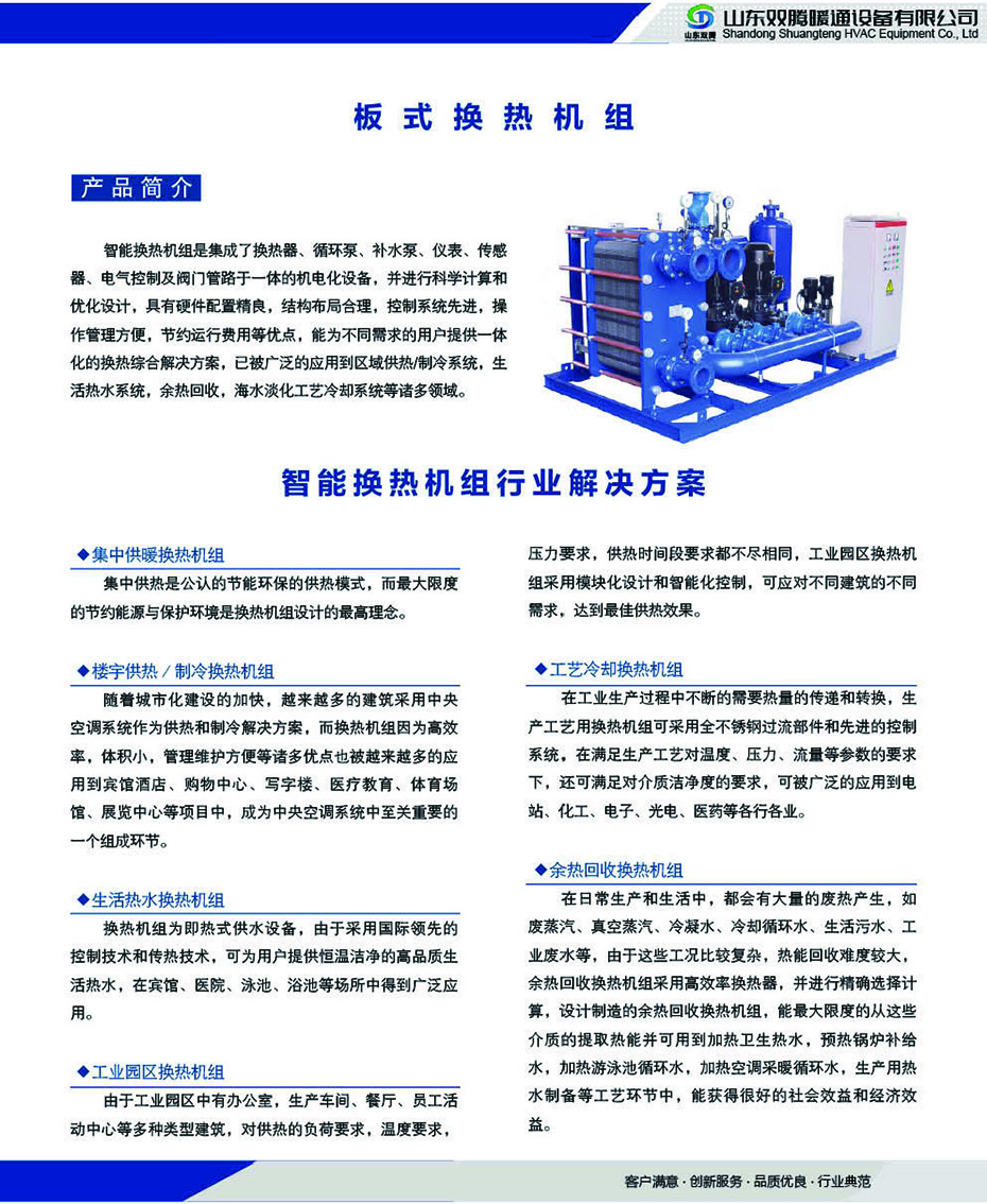 智能板式換熱機組是集成了換熱器、循環(huán)泵、補水泵、儀表、傳感器、電氣控制及閥門管路于一體的機電化設(shè)備并進行科學計算和優(yōu)化設(shè)計具有硬件配置精良結(jié)構(gòu)布局合理控制系統(tǒng)先進操作管理方便節(jié)約運行費用等優(yōu)點能為不同需求的用戶提供一體化的換熱綜合解決方案已被廣泛的應(yīng)用到區(qū)域供熱制冷系統(tǒng)生活熱水系統(tǒng)余熱回收海水淡化工藝冷卻系統(tǒng)等諸多領(lǐng)域。