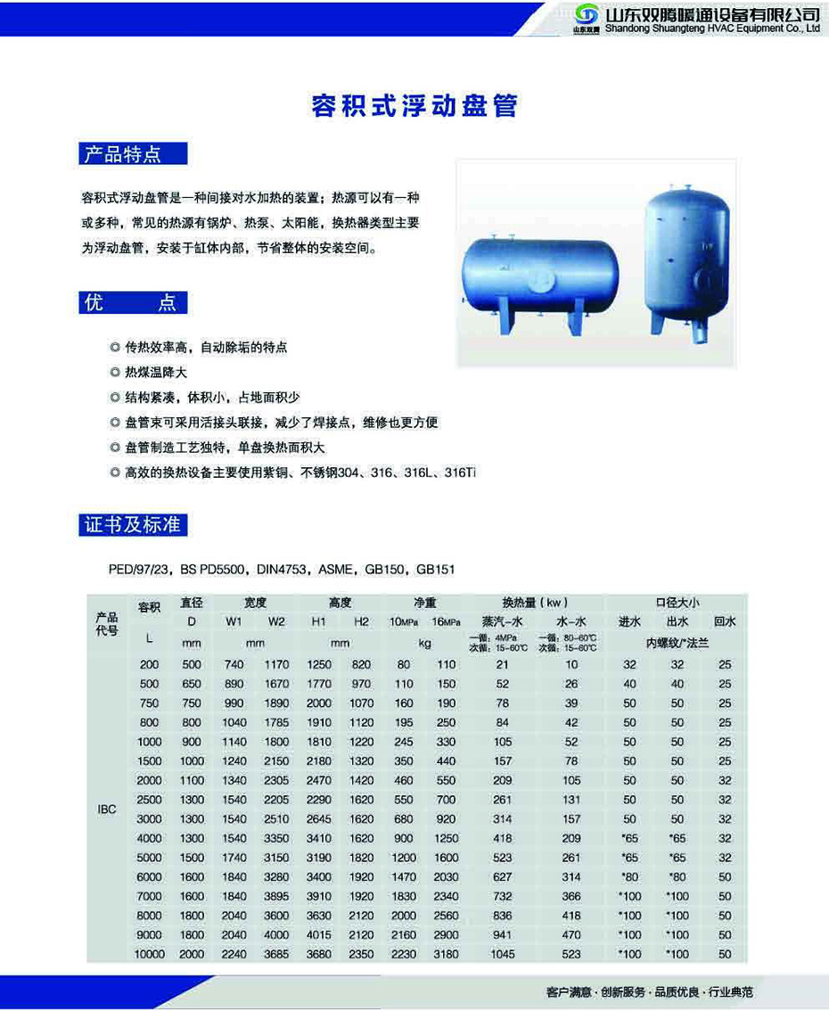 容積式浮動盤管是一種間接對水加熱的裝置;熱源可以有一種或多種,常見的熱源有鍋爐、熱泵、太陽能,換熱器類型主要為浮動盤管,安裝于缸體內(nèi)部,節(jié)省整體的安裝空間。