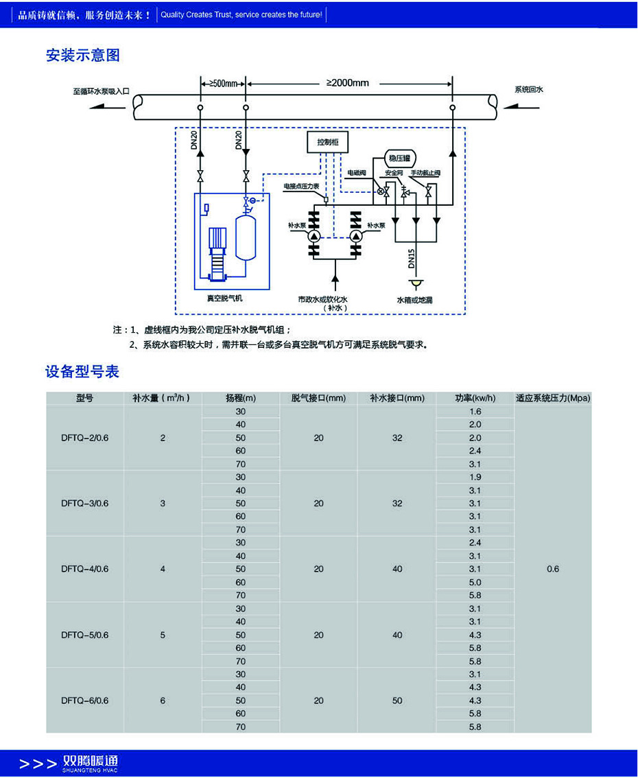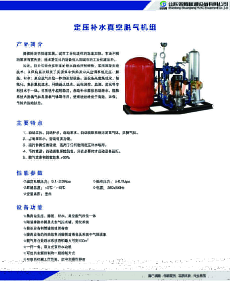 定壓補(bǔ)水真空脫氣機(jī)組是采用國(guó)際先進(jìn)技術(shù)研發(fā)的實(shí)現(xiàn)集中供熱及中央空調(diào)系統(tǒng)定壓、膨脹、補(bǔ)水、真空脫氣四位一體的新型設(shè)備。該設(shè)備在系統(tǒng)中起到穩(wěn)壓、自動(dòng)補(bǔ)水、膨脹自動(dòng)泄水,脫除系統(tǒng)內(nèi)游離氣體及溶解氣體等作用。使系統(tǒng)始終處于高效、環(huán)保、節(jié)能的運(yùn)動(dòng)狀態(tài)。