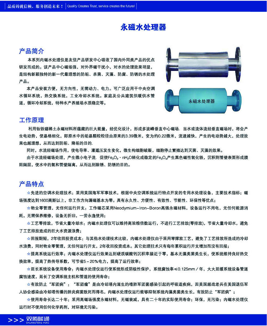 本系列內(nèi)永磁水處理器是友信產(chǎn)品研發(fā)中心吸收了國(guó)內(nèi)外同類產(chǎn)品的優(yōu)點(diǎn)研發(fā)而成的。該產(chǎn)品中心磁場(chǎng)強(qiáng)對(duì)外界磁干擾小對(duì)水的處理效果明顯是結(jié)構(gòu)新穎獨(dú)特的新一代最理想的防垢、殺菌、滅藻、防腐、防銹的水處理產(chǎn)品。本產(chǎn)品安裝方便無方向性無需動(dòng)力、電力??蓮V泛應(yīng)用干中央空調(diào)水循環(huán)系統(tǒng)熱交換系統(tǒng)工業(yè)冷卻水系統(tǒng)。家庭及公共建筑供暖供水管道循環(huán)冷卻系統(tǒng)特種水產(chǎn)養(yǎng)殖場(chǎng)水質(zhì)穩(wěn)定等。