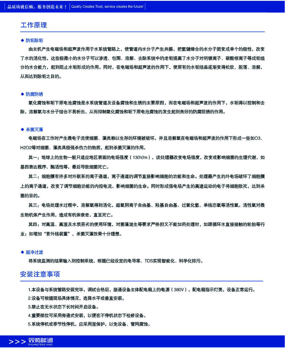 具有防垢、防腐、殺菌滅藻、超凈過濾的綜合功能采用物理處理方式和化學(xué)處方式相結(jié)合的綜合水處理技術(shù)輔助水質(zhì)綜合控制和水質(zhì)動(dòng)態(tài)監(jiān)測(cè)等功能實(shí)現(xiàn)水質(zhì)全位綜合處理水質(zhì)調(diào)節(jié)、穩(wěn)定控制并可大大降低化學(xué)藥劑的投加量2從根本上解決了以下問題①物理處理方式在補(bǔ)水水質(zhì)、循環(huán)水水質(zhì)、系統(tǒng)工況等惡劣條件下處理效果不顯等問題。